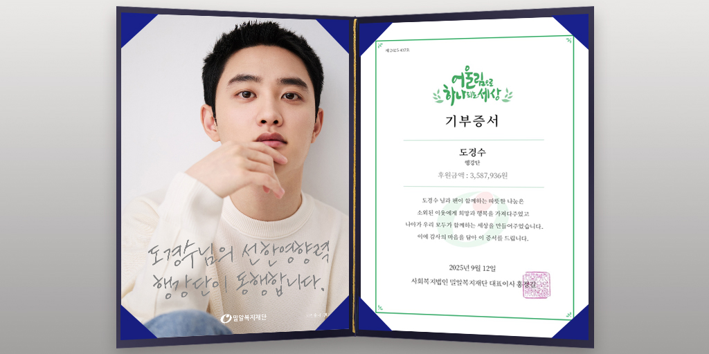 가수 겸 배우 도경수 팬덤, 장애아동 의료비 지원 위해 밀알복지재단에 후원금 전달