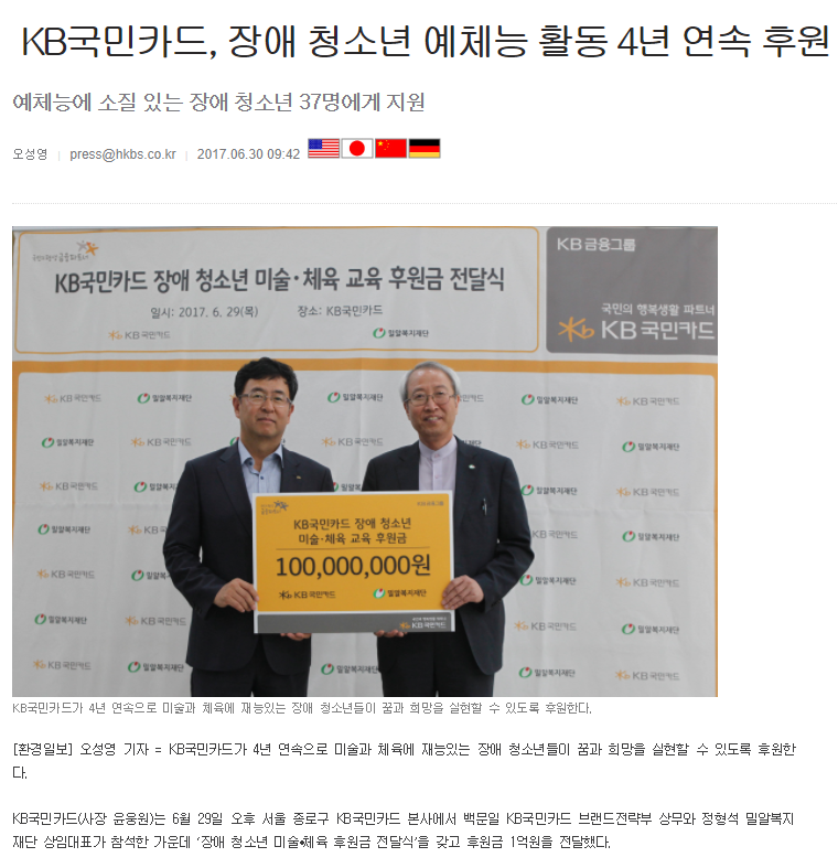 [에이블뉴스] KB국민카드, ‘장애청소년 꿈 실현’ 후원금 1억원 기부