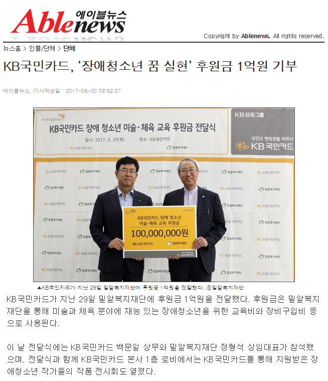 [에이블뉴스] KB국민카드, ‘장애청소년 꿈 실현’ 후원금 1억원 기부