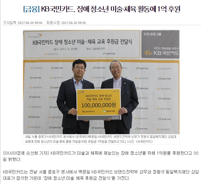 [아시아경제] KB국민카드, 장애 청소년 미술·체육 활동에 1억 후원