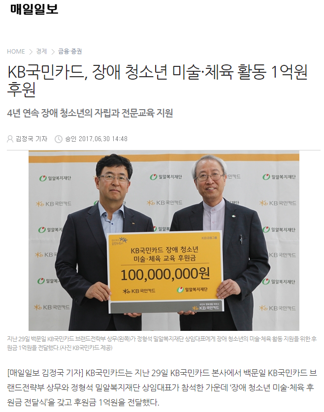[매일일보] KB국민카드, 장애 청소년 미술·체육 활동 1억원 후원