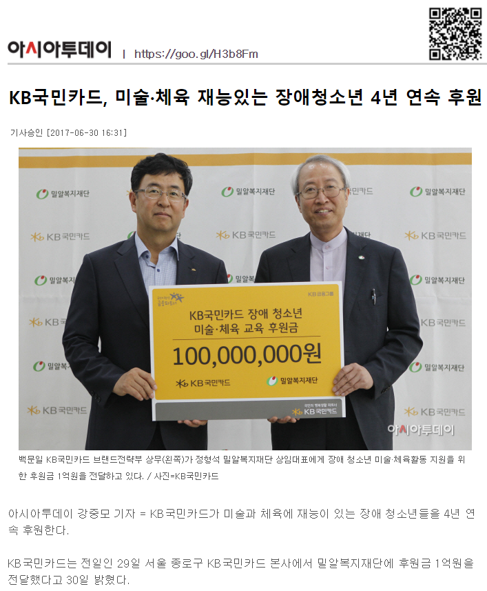 [CNB뉴스] KB국민카드, 장애 청소년 미술·체육 후원금 1억원 전달