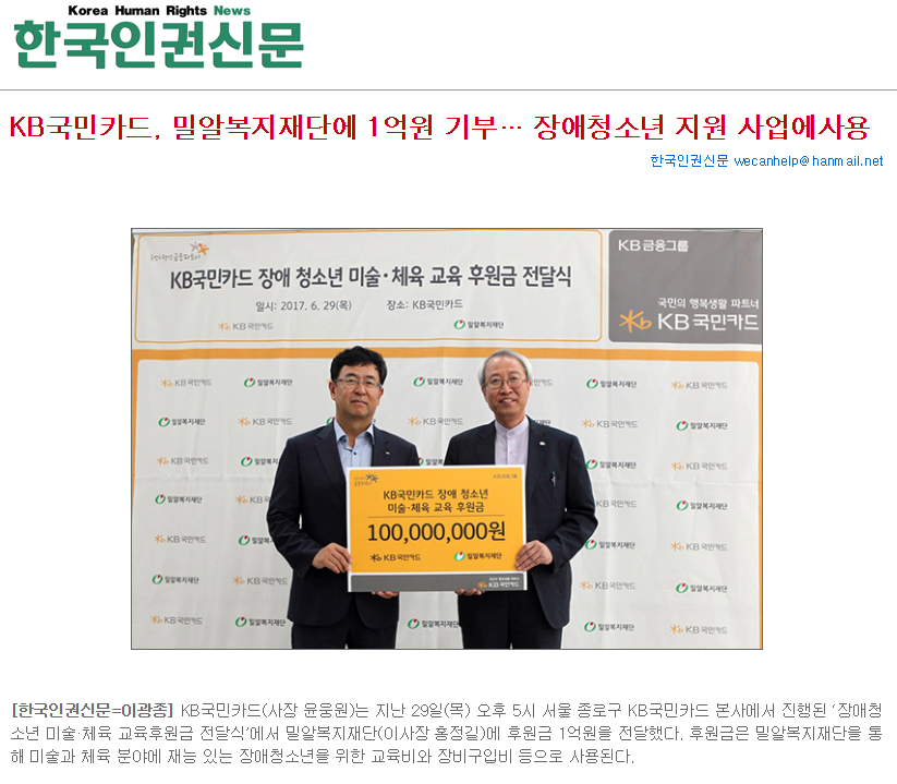 [한국인권신문] KB국민카드, 밀알복지재단에 1억원 기부… 장애청소년 지원 사업에사용
