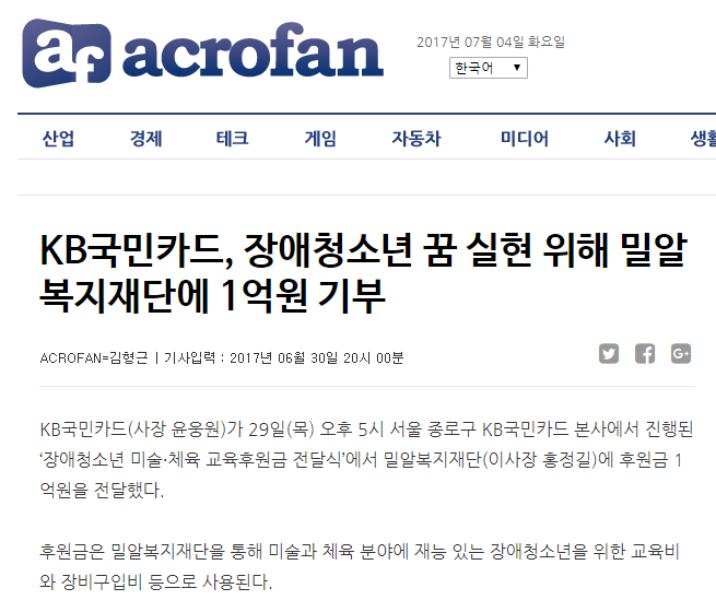 [아크로팬] KB국민카드, 장애청소년 꿈 실현 위해 밀알복지재단에 1억원 기부