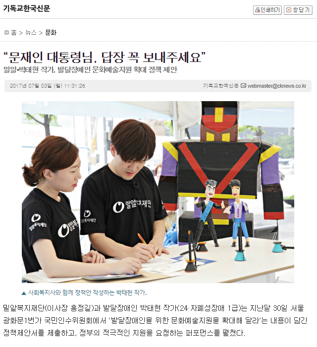 [웰페어뉴스] 박태현 작가, 광화문1번가에 발달장애인 문화예술지원 확대 정책 제안
