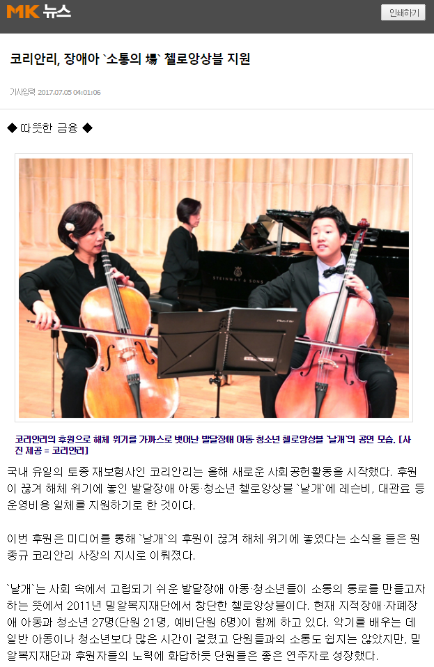 [매일경제] 코리안리, 장애아 '소통의 場' 첼로앙상블 지원