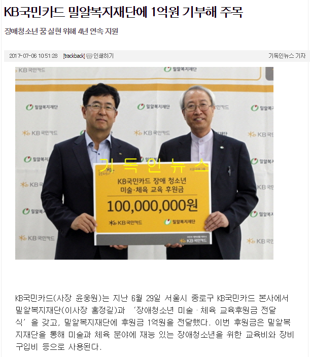 [기독인뉴스] KB국민카드 밀알복지재단에 1억원 기부해 주목