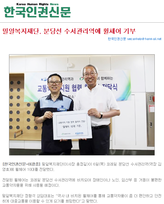 [[한국인권신문] 밀알복지재단, 분당선 수서관리역에 휠체어 기부