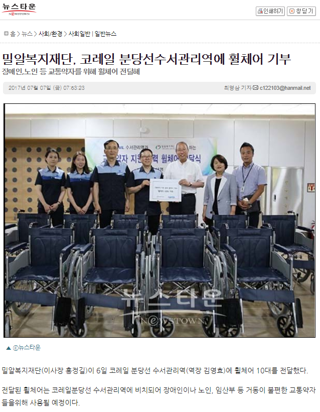 [뉴스타운] 밀알복지재단, 코레일 분당선수서관리역에 휠체어 기부
