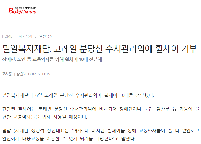 [복지연합신문] 밀알복지재단, 코레일 분당선 수서관리역에 휠체어 기부