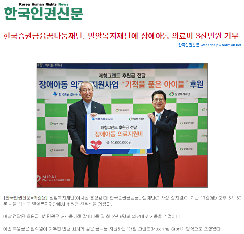 [한국인권신문] 한국증권금융꿈나눔재단, 밀알복지재단에 장애아동 의료비 3천만원 기부
