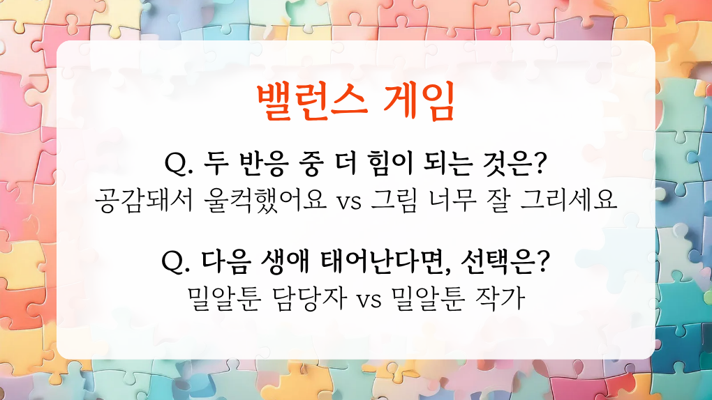 최인서 기자: 밀알툰 작가 vs 밀알툰 담당자, 다음 생에 태어난다면?