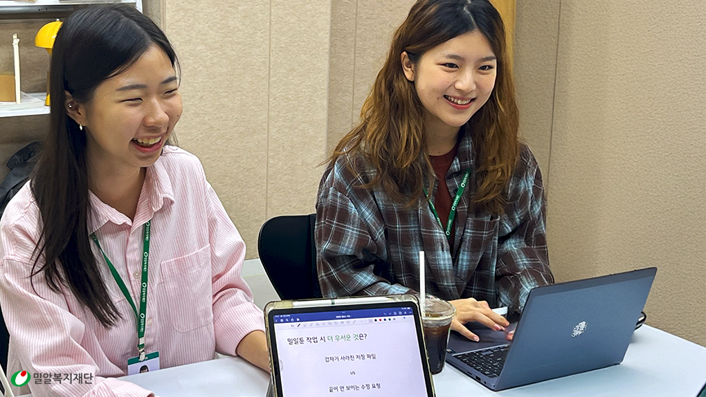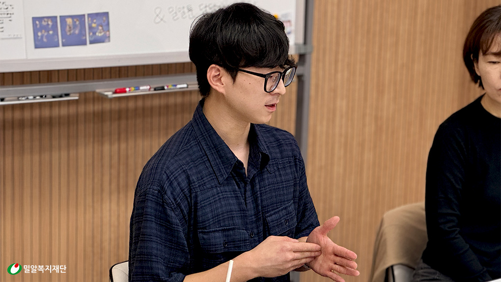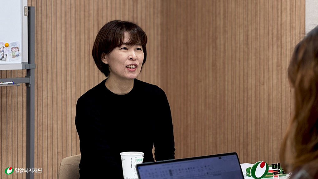 안녕하세요. 저는 밀알복지재단 커뮤니케이션실 유종화 간사입니다. 저는 스토리텔링 공모전 관련 업무를 하고 있습니다. 수상작을 바탕으로 한 밀알툰 제작이 저의 대표적인 업무이고, 또 수상작을 연예인분들이나 성우분들이 읽어주시는 오디오북으로도 제작하고 있습니다. 그리고 SNS도 담당하고 있어서 지금 진행하는 이 ‘밀터뷰’를 업로드하는 것도 저의 업무가 될 것 같습니다.