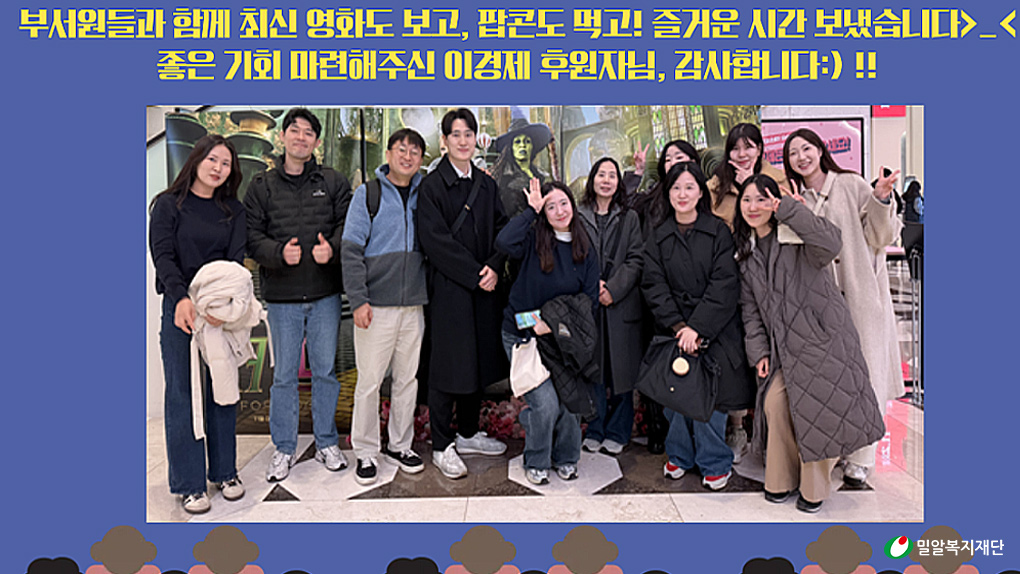 조직문화 프로그램으로는 분기별 문화체험 프로그램인 ‘공감플러스’가 있는데요. 저희 밀알복지재단의 후원자인 이경제 한의사님이 ‘재단 직원들을 위해서도 써달라’며 기부를 해 주셨어요. 덕분에 전 직원들이 분기별로 한번씩, 부서별로 영화를 보러 가거나 전시회에 방문하는 등 문화체험 활동을 하고 있습니다. 잠시 업무에서 벗어나 환기도 하고, 직원들끼리 교류하는 시간이 생기니 조직 분위기가 한층 더 활기차진 느낌이에요.
