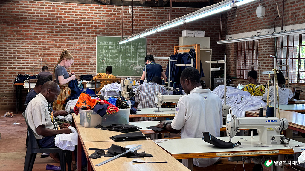현지에서 직접 마주한 사람들과의 정서적인 교감 또한 잊을 수 없는 순간이었습니다. 그 따뜻함을 가장 깊게 느꼈던 곳은 밀알복지재단에서 운영 중인 말라위 은코마 지역의 장애인 공동작업장이었습니다. 제가 방문했을 당시 직원분들은 교복 생산에 집중하고 계셨는데요, 처음 만난 저를 환하게 맞아 주셔서 바디랭귀지를 활용해 열심히 소통했습니다.