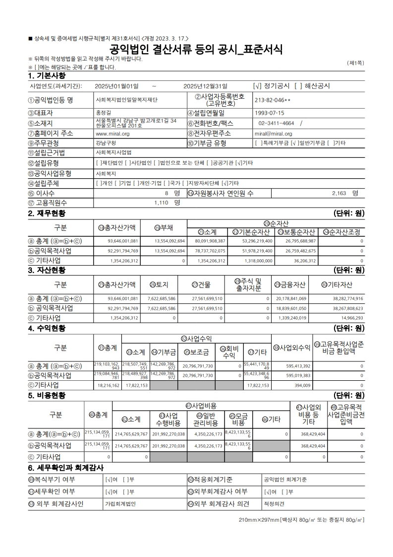 2025년도 공익법인 결산서류를 국세청 인터넷 홈페이지에 공시하였음을 안내드립니다.