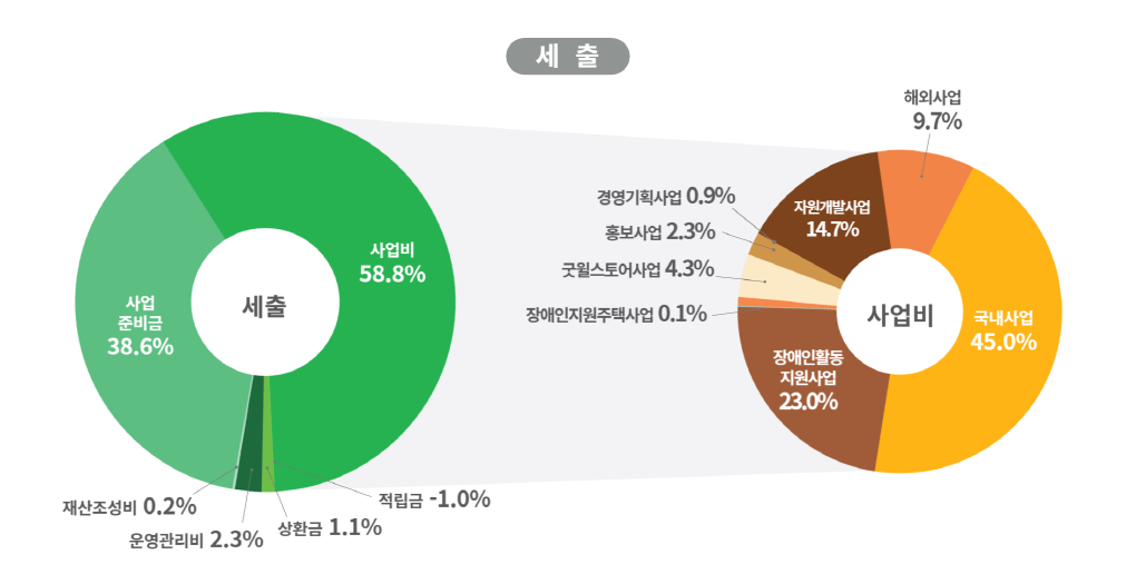 | 사업비 | 국내사업 | 국내아동결연, 장애인/장애아동 의료 및 교육지원, 위기가정지원, 지역사회복지사업, 인식개선사업, 발달장애인주간활동서비스, 밀알문화예술센터, 헬렌켈러지원센터, 시청각학습지원센터 등 |