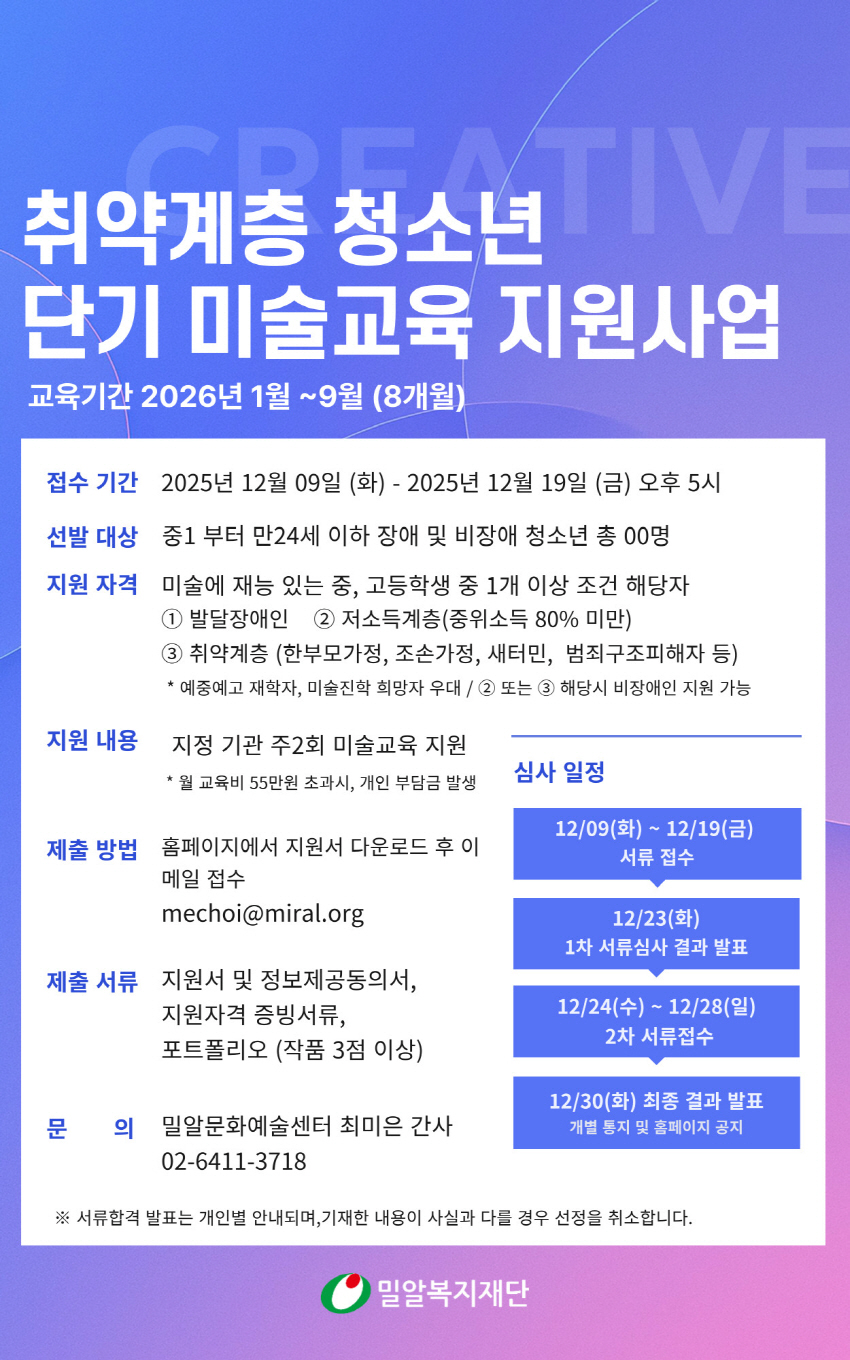 6. 문의: 밀알복지재단 밀알문화예술센터 최미은 간사(02-6411-3718)