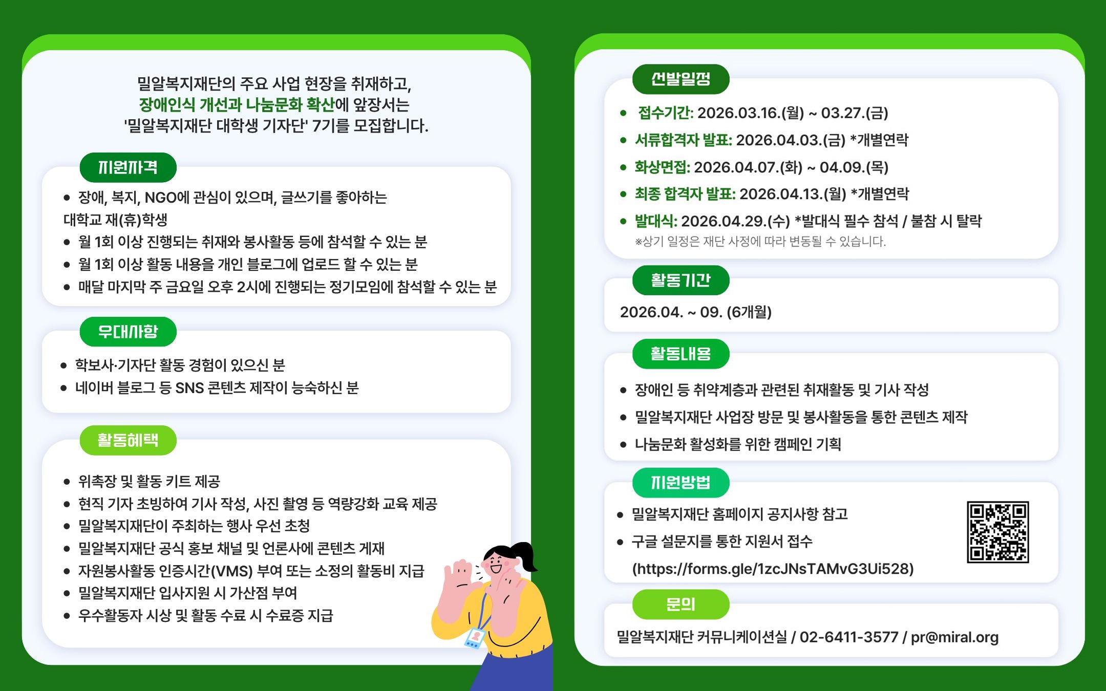 지원 자격은 장애·복지·NGO 분야에 관심이 있고 글쓰기를 좋아하는 대학교 재학생 및 휴학생이다. 월 1회 이상 진행되는 취재 및 봉사활동에 참여할 수 있어야 한다. 학보사나 기자단 활동 경험이 있거나 네이버 블로그 등 SNS 콘텐츠 제작에 능숙한 지원자는 우대한다.